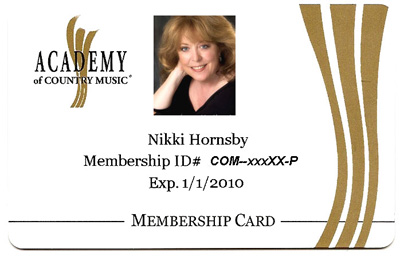 Above: Academy of Country Music Card - ACM voting member. Nikki Hornsby was honored in the 90s with four nominations to their Board of Directors view on Pg.12.